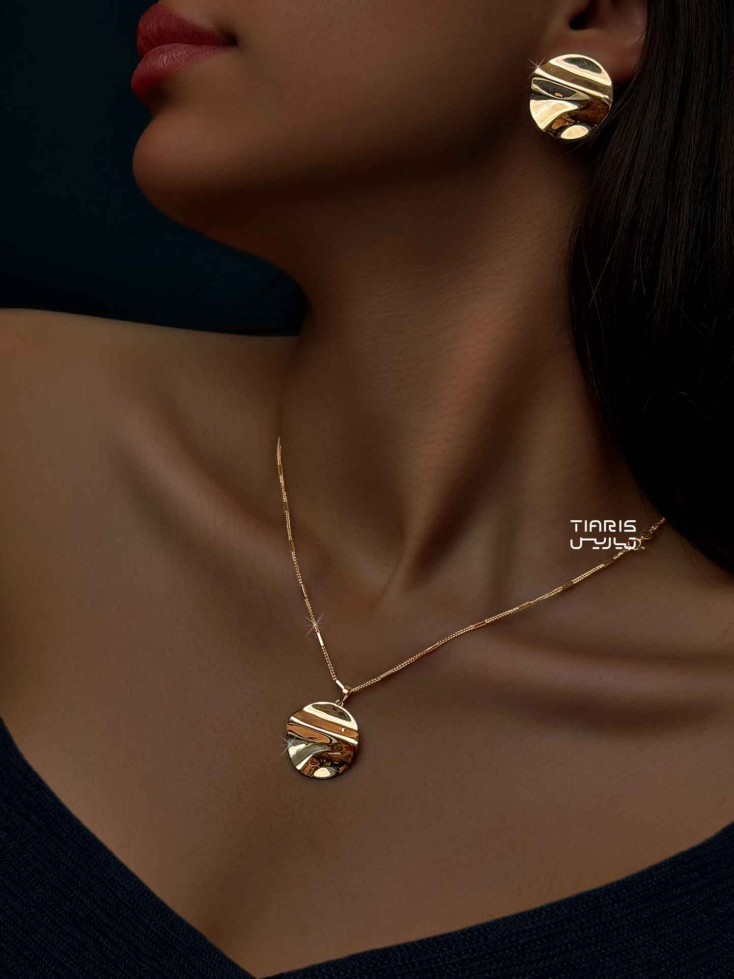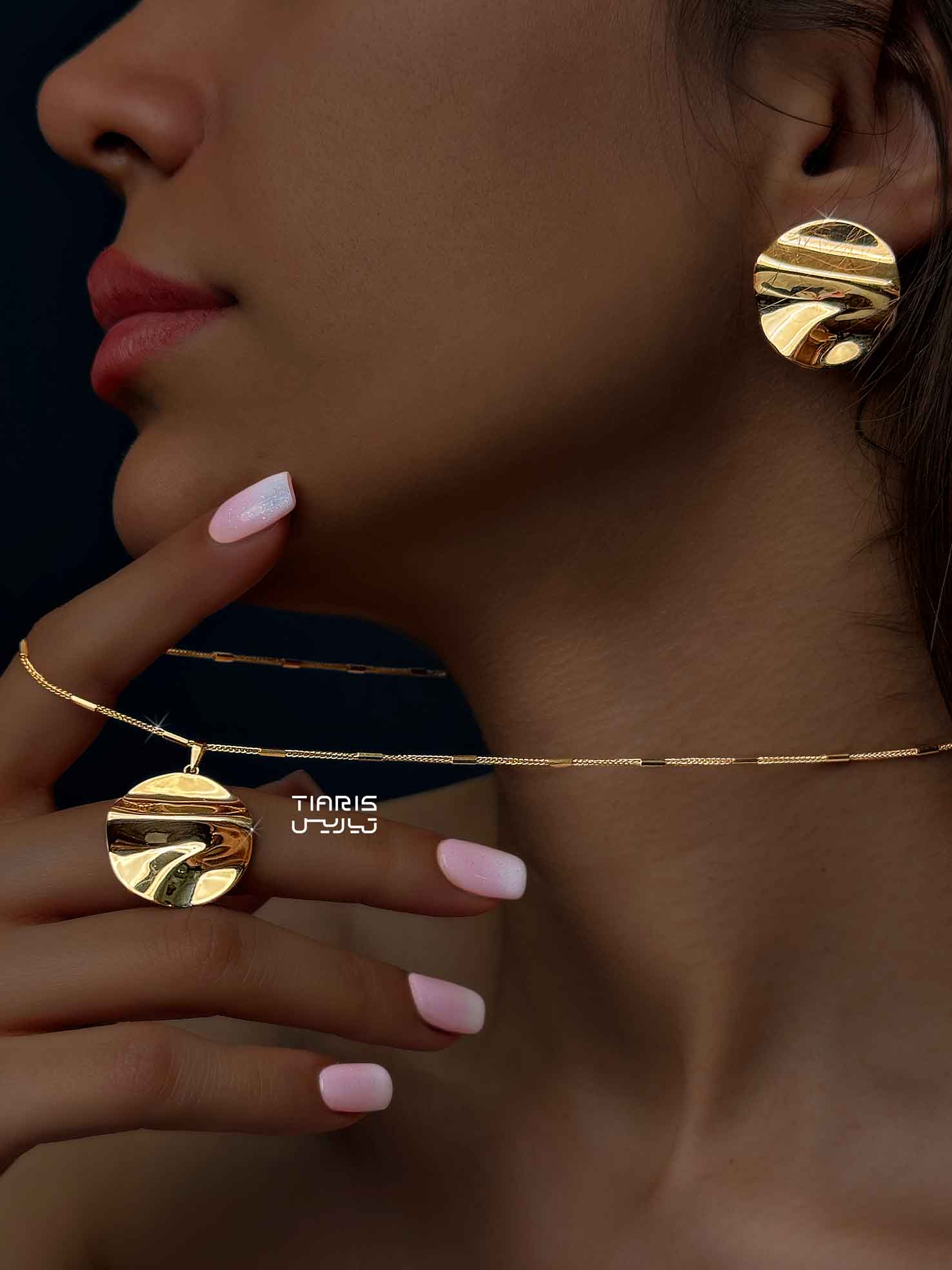 نیم ست طلا دخترانه دفرمه با وزن سبک و طراحی جمعوجور، انتخابی ایدهآل برای استفاده روزمره یا حتی استایلهای رسمی است.