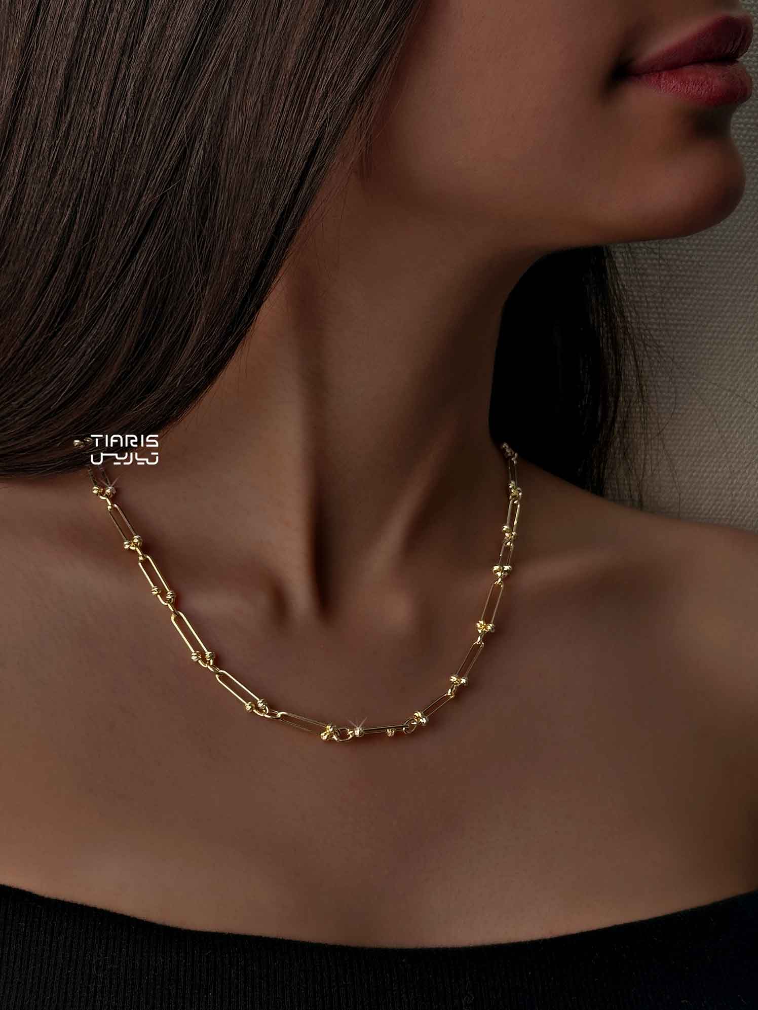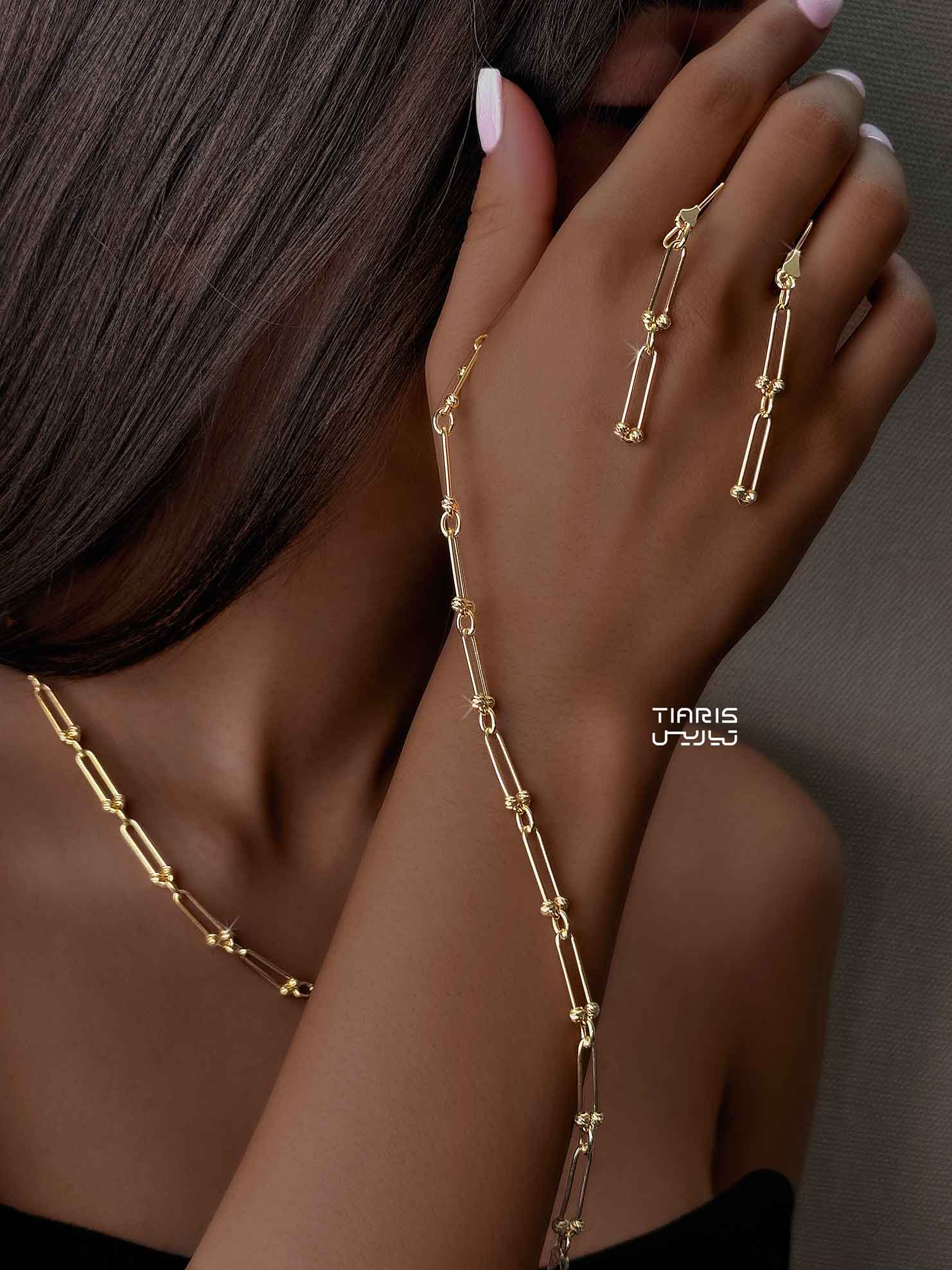 در نهایت، اگر بهدنبال سرویس طلای زنانه خاص هستید که هم ظریف باشد و هم طراحی آن متفاوت و الهامبخش، این مدل با گویهای طلایی درون حلقههای متصل، همان انتخابیست که برای درخشیدن نیاز دارید.